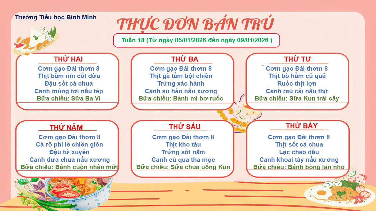 Thực đơn bán trú tuần 18 (từ ngày 05/01/2026 đến ngày 09/01/2026)
