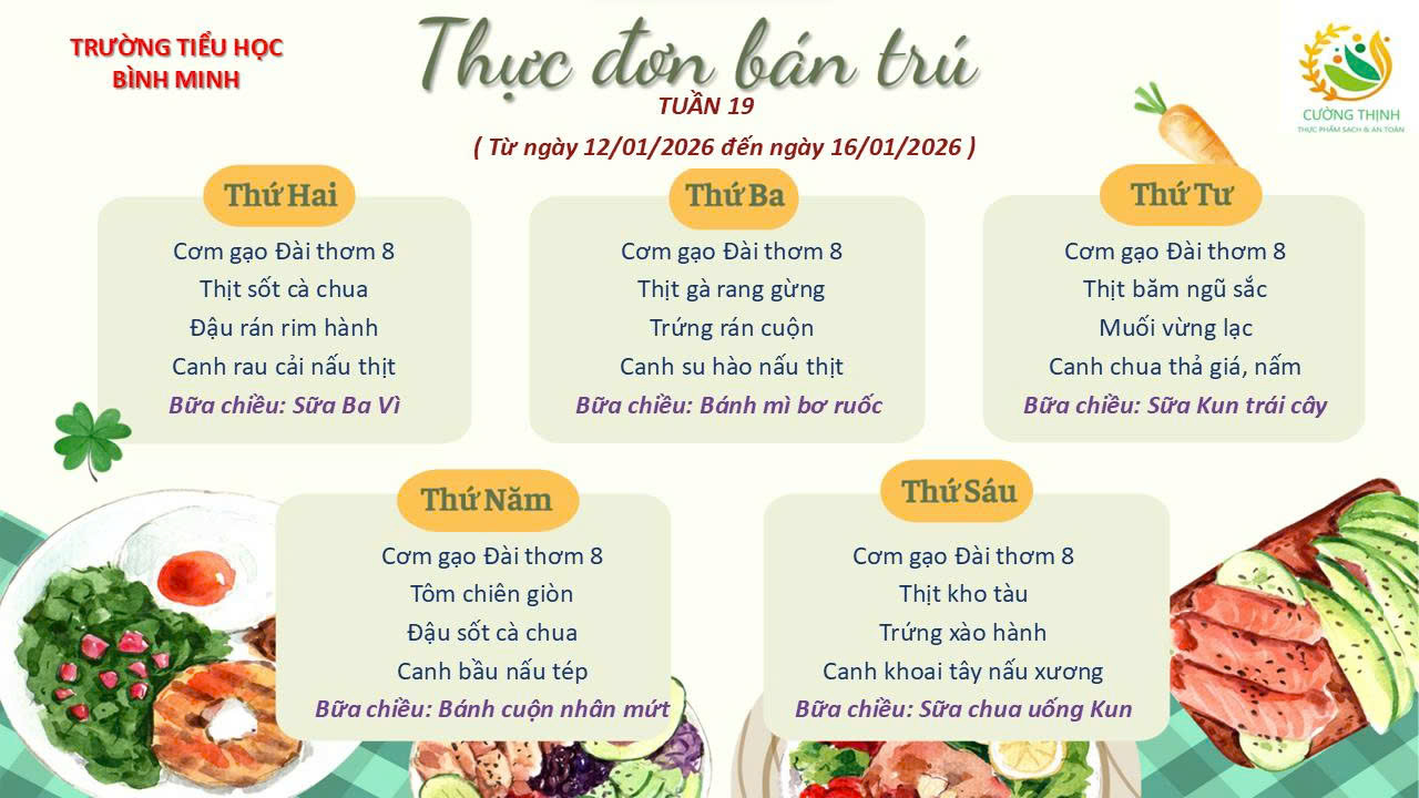 Thực đơn bán trú tuấn 19 (từ ngày 12/01/2026 đến ngày 16/01/2026)
