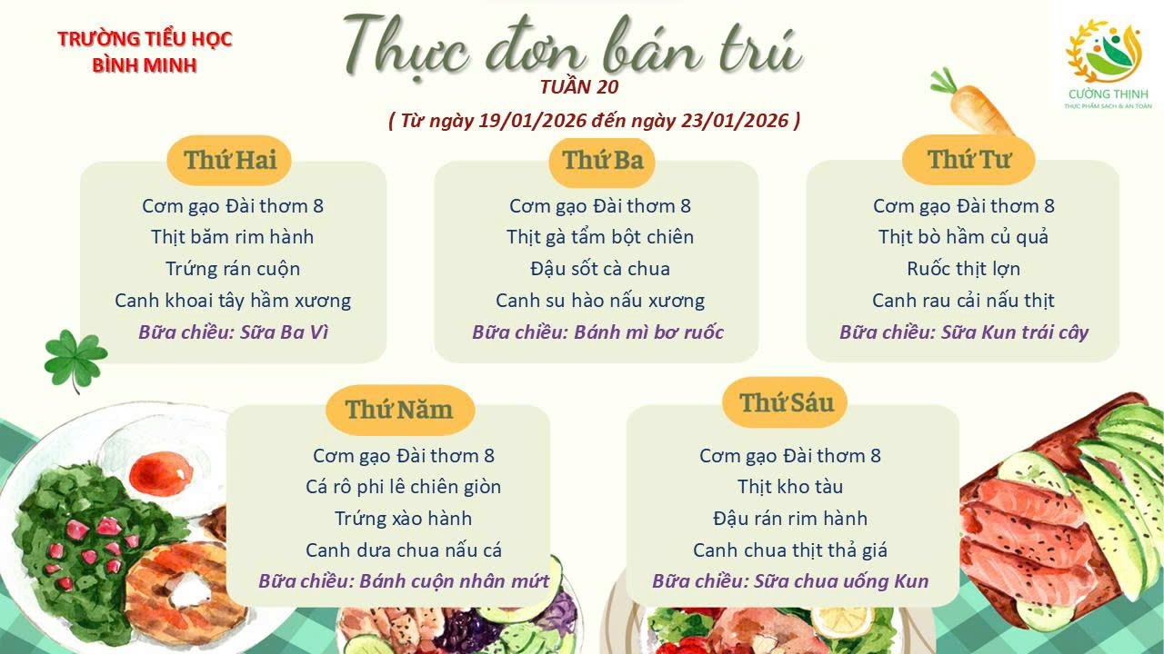 Thực đơn bán trú tuần 20 (từ ngày 19/01/2026 đến ngày 23/01/2026)