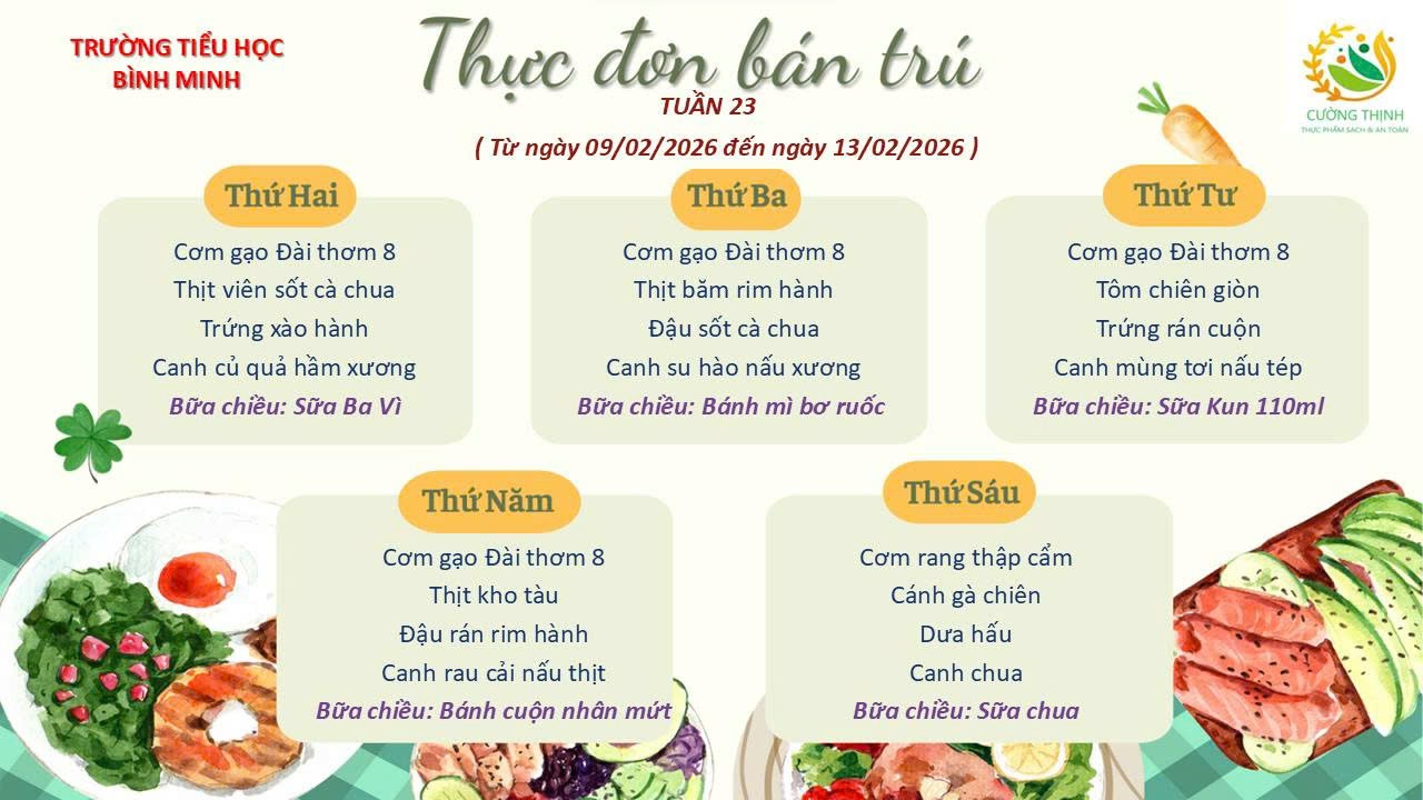 Thực đơn bán trú tuần 23 (từ ngày 09/02/2026 đến ngày 13/02/2026)